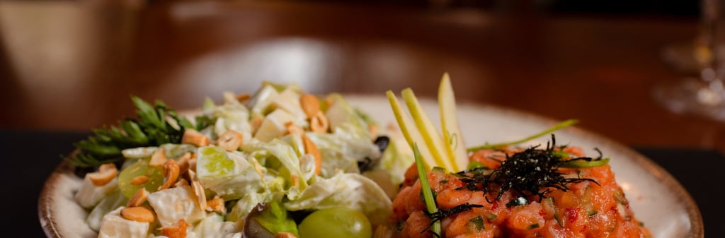 Tartare de salmão acompanhado de salada de alface, castanhas de cajú, maça verde, uva verde e molho de maionese