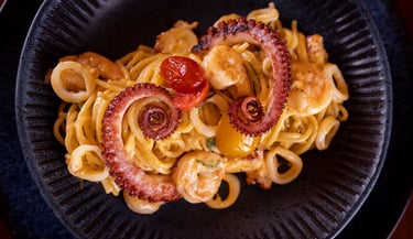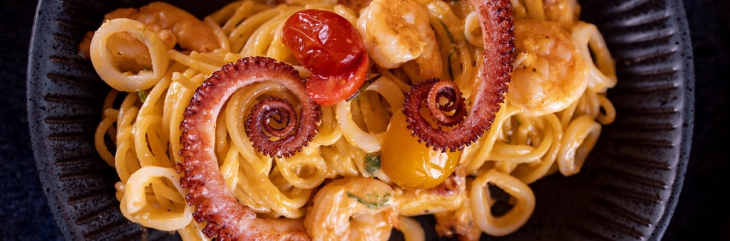 Tomate italiano, camarão, lula, marisco e polvo