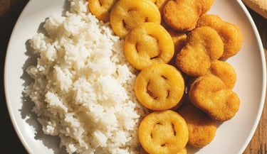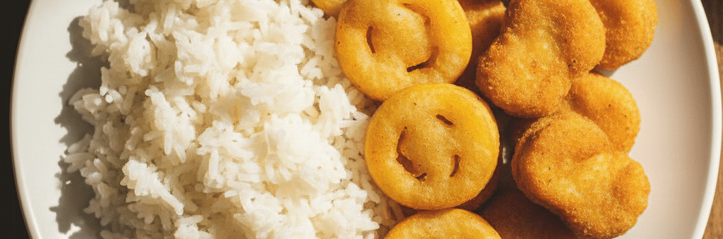 Nuggets Acompanhados de Arroz Branco e Batatas Smile.